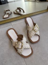 Sandália Rasteira Couro Branca Aplique Dourado - MIRVIE Calçados