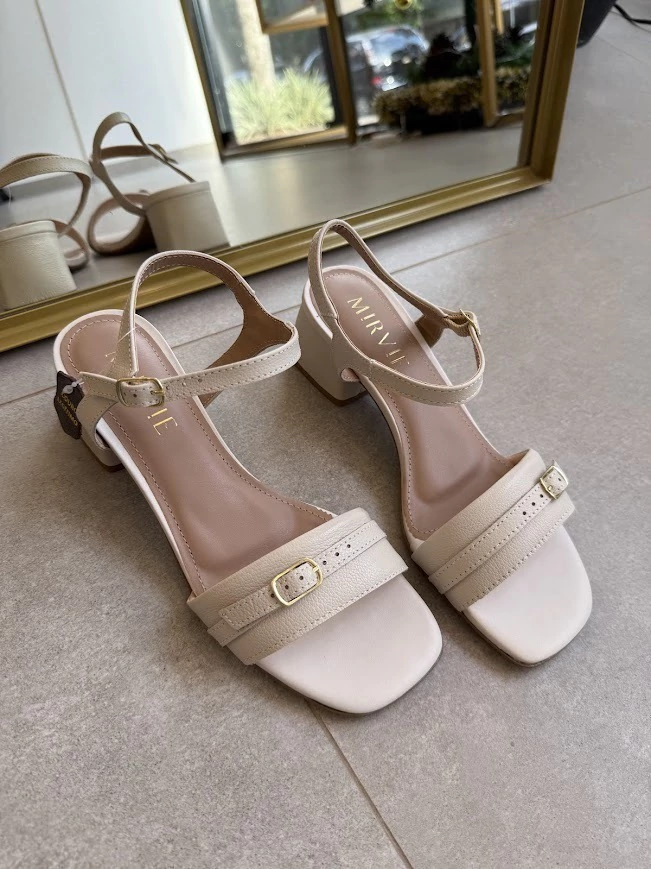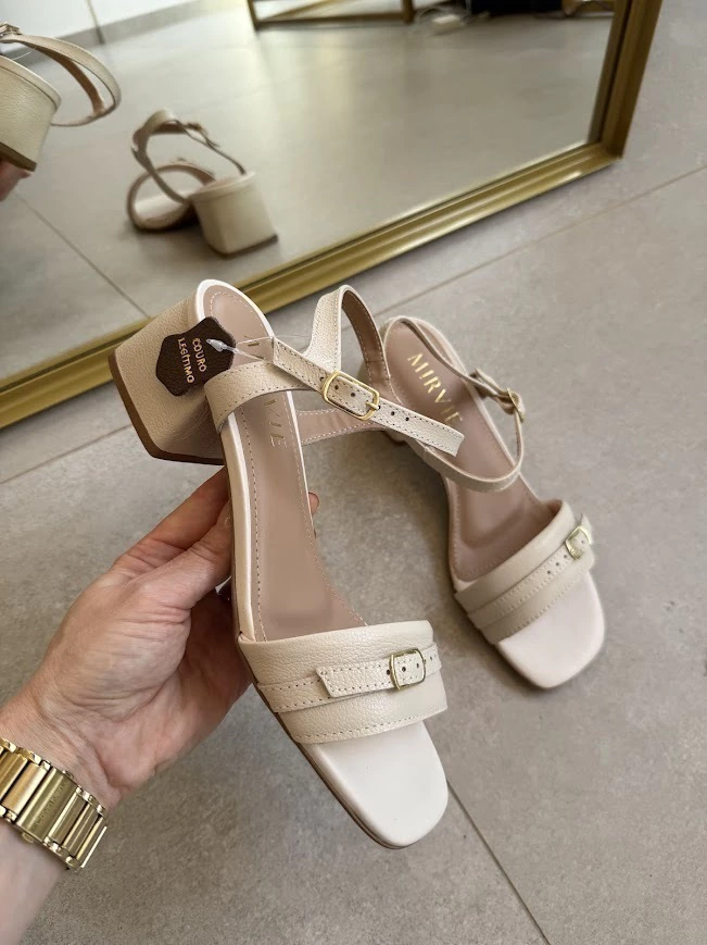 Sandália feminina material liso, de visual minimalista. O sapato possui salto média em bloco e formato quadrado na ponta. Traz tira sobre os dedos, com detalhe de pequena fivela dourada na tira superior. Possui tira fina que parte das laterais e envolve o tornozelo, fechando em fivela lateral dourada. Conta com palmilha em tom caramelo, com inscrição da marca em dourado. A sandália mantém o pé bem à mostra, realçando um estilo leve e elegante.