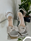 Sandália prata laço strass. Com seu bico quadrado e salto flare de 9 cm, ela combina perfeitamente estilo moderno e elegância clássica. Material de alta qualidade utilizado na fabricação adiciona um toque de sofisticação, na cor prata oferece versatilidade e charme. O detalhe do lacinho de stras no cabedal confere um toque feminino e delicado, tornando a sandália Barbara uma escolha perfeita para ocasiões especiais ou para adicionar um toque de glamour ao seu visual diário.