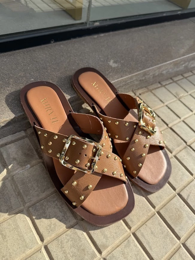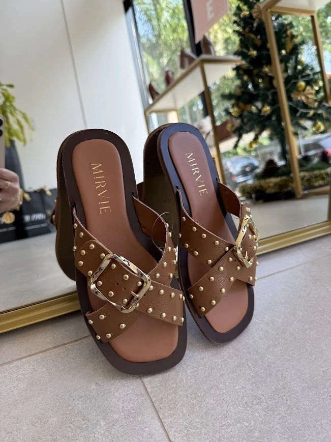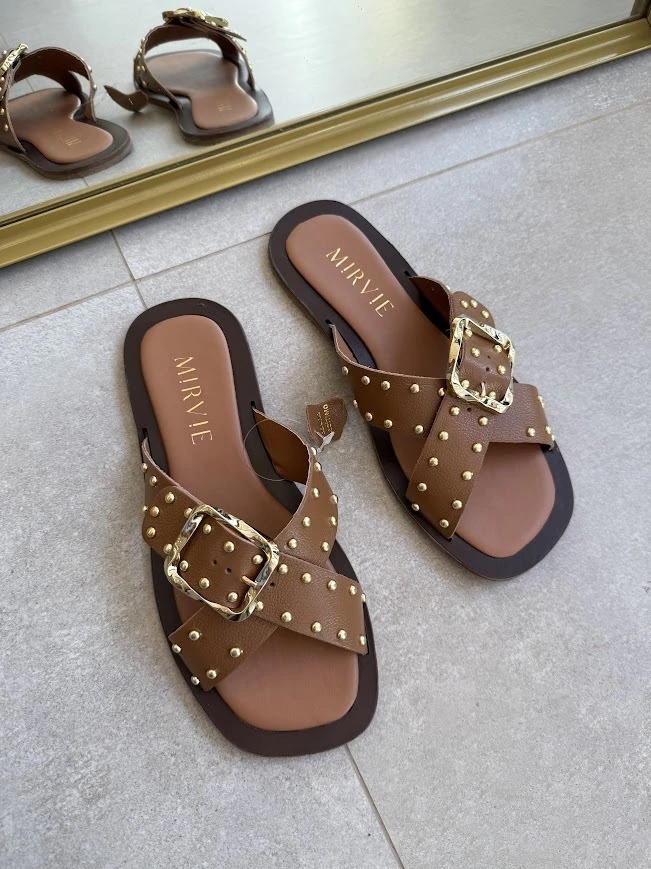 Sandália rasteira feminina em couro legítimo, na cor caramelo. O modelo apresenta duas tiras largas cruzadas sobre o peito do pé, inteiramente adornadas por aplicações metálicas douradas em formato de tachas. Cada tira possui uma fivela grande dourada, que acrescenta destaque e personalidade ao design. A palmilha em tom claro segue o formato quadrado, com bordas em marrom, trazendo um visual moderno e bem estruturado. A sandália deixa o pé totalmente à mostra, unindo conforto, estilo e um toque marcante.