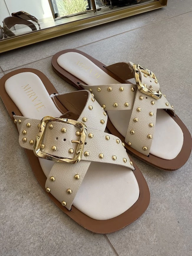 Sandália rasteira feminina em couro legítimo, na cor off-white. O modelo apresenta duas tiras largas cruzadas sobre o peito do pé, inteiramente adornadas por aplicações metálicas douradas em formato de tachas. Cada tira possui uma fivela grande dourada, que acrescenta destaque e personalidade ao design. A palmilha em tom claro segue o formato quadrado, com bordas em marrom, trazendo um visual moderno e bem estruturado. A sandália deixa o pé totalmente à mostra, unindo conforto, estilo e um toque marcante.