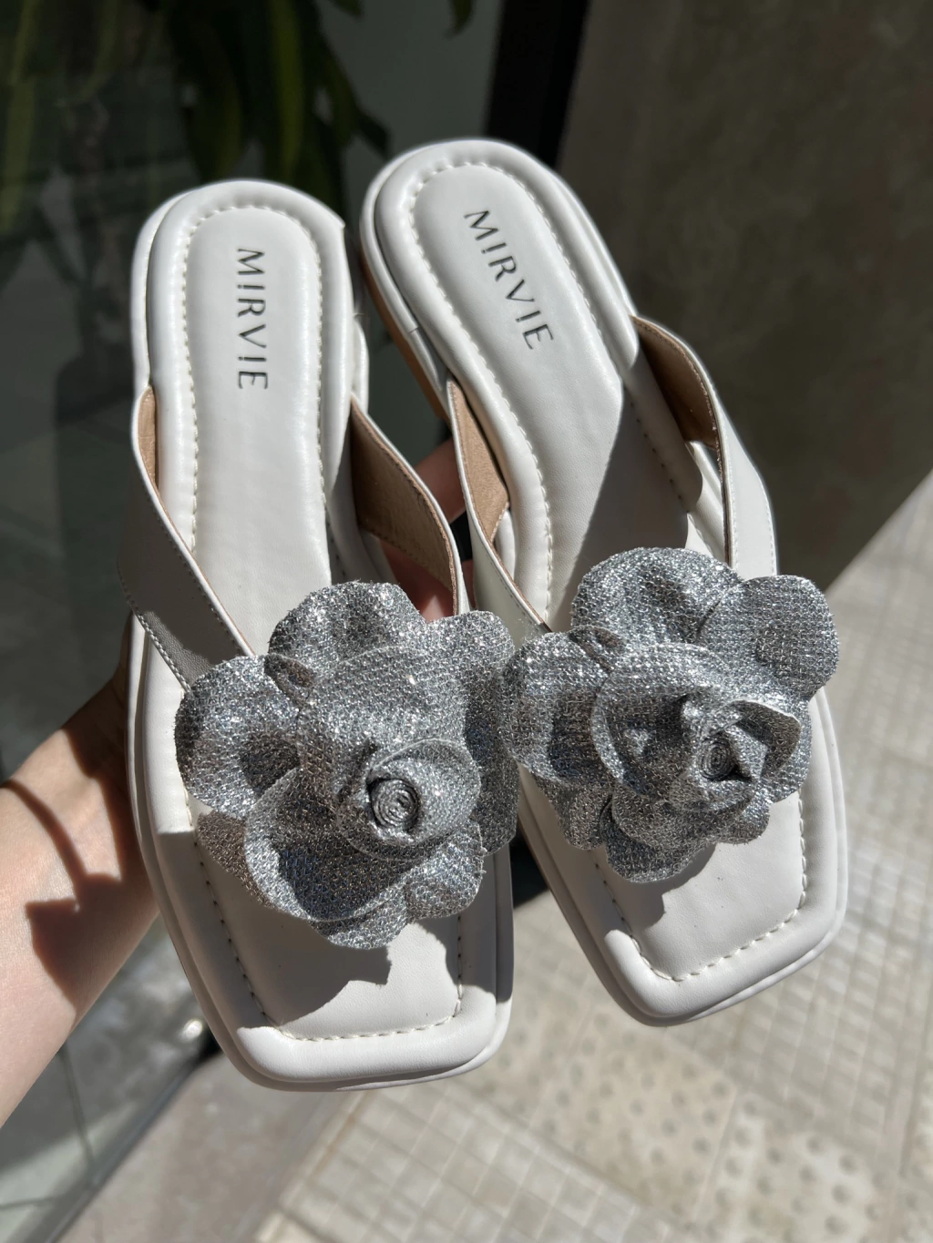 Sandália rasteira Off-White rosa brilho. Fabricada com o luxuoso material ipanema com cretone, esta peça é um verdadeiro deleite para os olhos. A cor off-white clássica proporciona versatilidade, enquanto a pétala de rosa artisticamente trabalhada em brilhos no cabedal adiciona um toque de romance. Cada detalhe foi cuidadosamente pensado para transmitir sofisticação. Aposte!