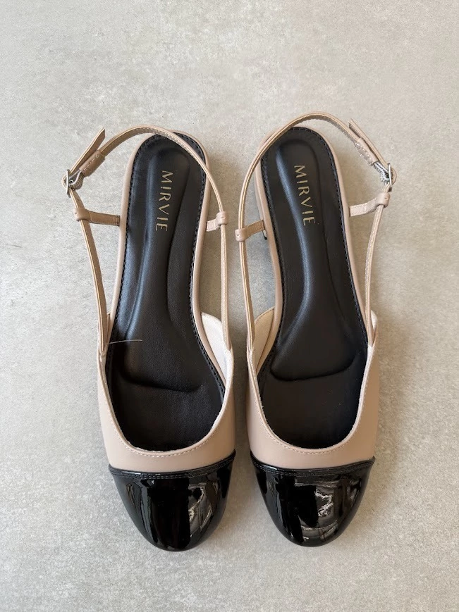 A Sapatilha Slingback Bicolor Camille possui uma biqueira envernizada preta e um corpo fosco off-white. Suas finas tiras ajustáveis no tornozelo conferem um fechamento delicado, combinando elegância e conforto para diversas ocasiões.