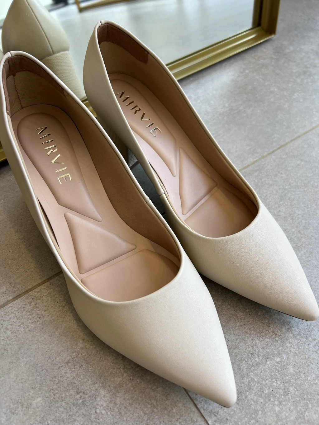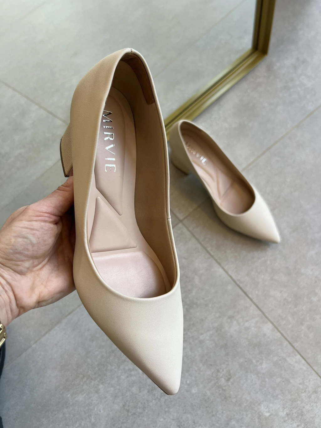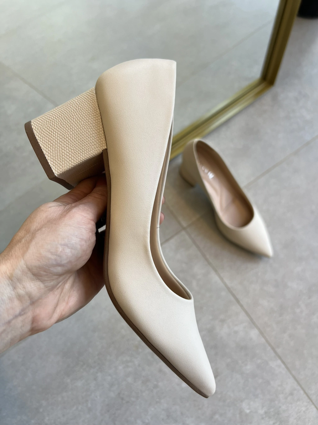 Scarpin de salto bloco médio bege, com design sofisticado e moderno. O salto bloco de altura moderada oferece estabilidade e um toque contemporâneo. O acabamento em napa bege proporciona um visual refinado e um toque suave. Com bico fino, o scarpin adiciona elegância e sofisticação, sendo ideal tanto para ocasiões formais quanto para o dia a dia de trabalho.