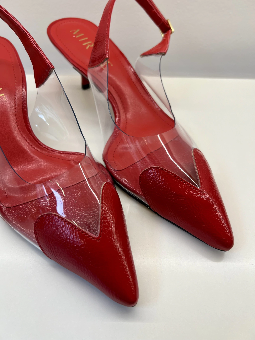 Scarpin Slingback com salto taça de 6cm, confeccionado em vinil transparente e acabamento em verniz wetting vermelho. Apresenta bico fino com detalhe em formato de coração. O modelo é aberto na parte traseira e possui fechamento lateral por tira com ajuste.