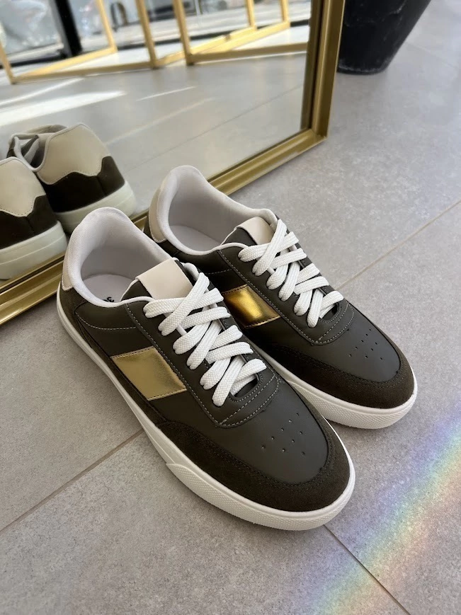 Tênis verde militar com detalhes dourados. O modelo possui solado baixo emborrachado off white, com laterais em material sintético verde e detalhes em camurça. Traz aplicações douradas na lateral e contorno inferior em camurça verde. Com formato arredondado na ponta, o tênis tem fecho em cadarços off white e uma etiqueta metálica dourada na lateral.